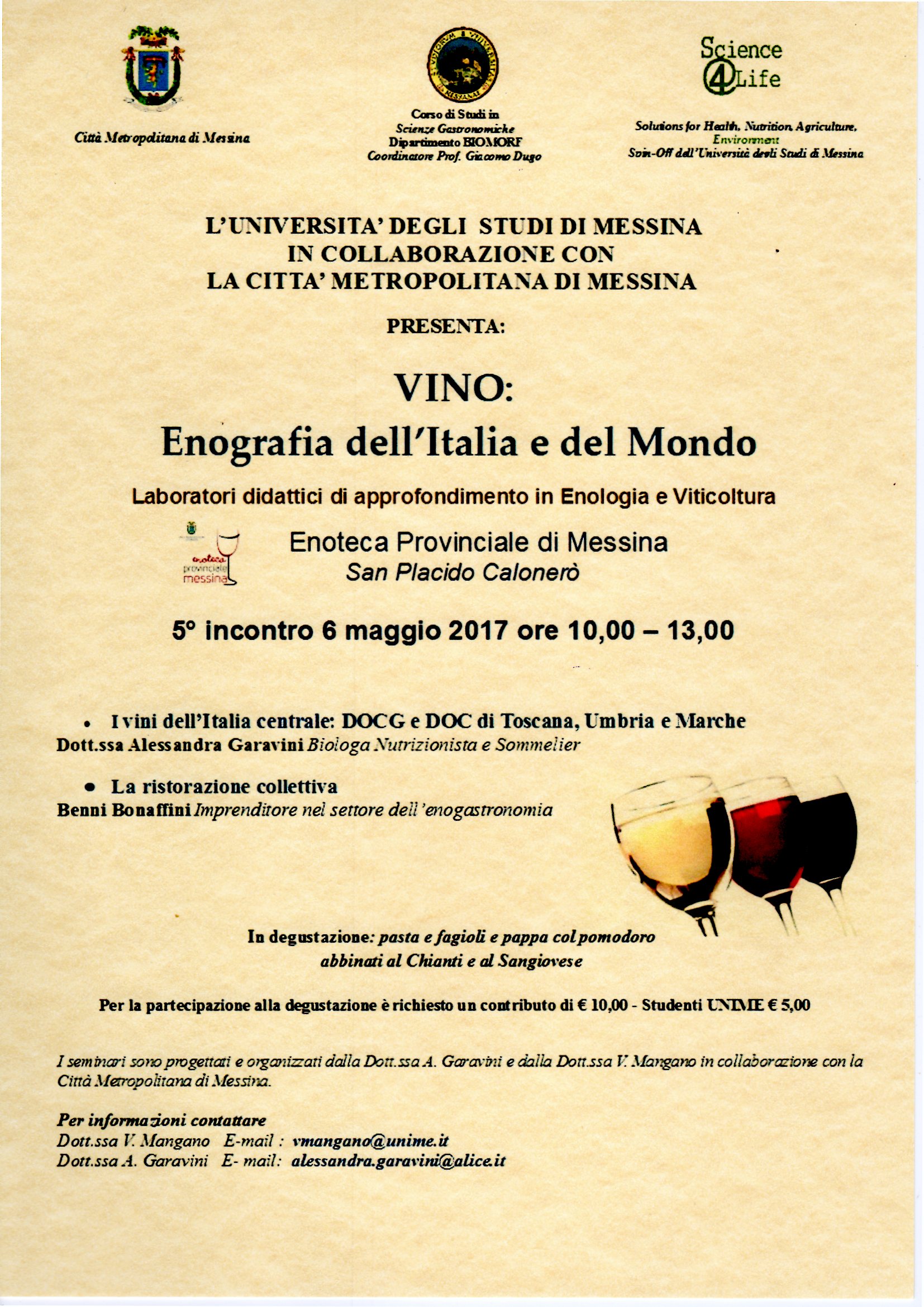 ggio 2017, dalle ore 10.00 alle ore 13.00 a San Placido Calonerò presso l’Enoteca provinciale di Messina, si terrà il quinto degli otto laboratori didattici in enologia e viticoltura dal titolo "Vino: Enografia dell'Italia e del Mondo", organizzato dall'Università degli Studi di Messina in collaborazione con la Città Metropolitana.