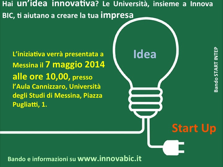 Hai un'idea innovativa? Le Università, insieme ad Innova BIC, ti aiutano a creare la tua impresa. L'iniziativa verrà presentata a Messina il 7 maggio 2014, alle ore 10.00, presso l'Aula Cannizzaro, Università degli Studi di Messina, Piazza Pugliatti 1.