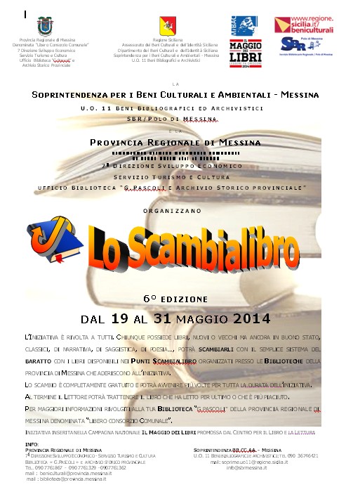 Avrà luogo dal 19 al 31 maggio 2014 la sesta edizione dell’iniziativa Lo Scambialibro organizzata dalla Provincia Regionale di Messina , Servizio Turismo e Cultura, in collaborazione con l’U.O. XI Beni Bibliografici ed Archivistici della Soprintendenza per i Beni Culturali ed Ambientali di Messina - Sistema Bibliotecario SBR/Polo di Messina.