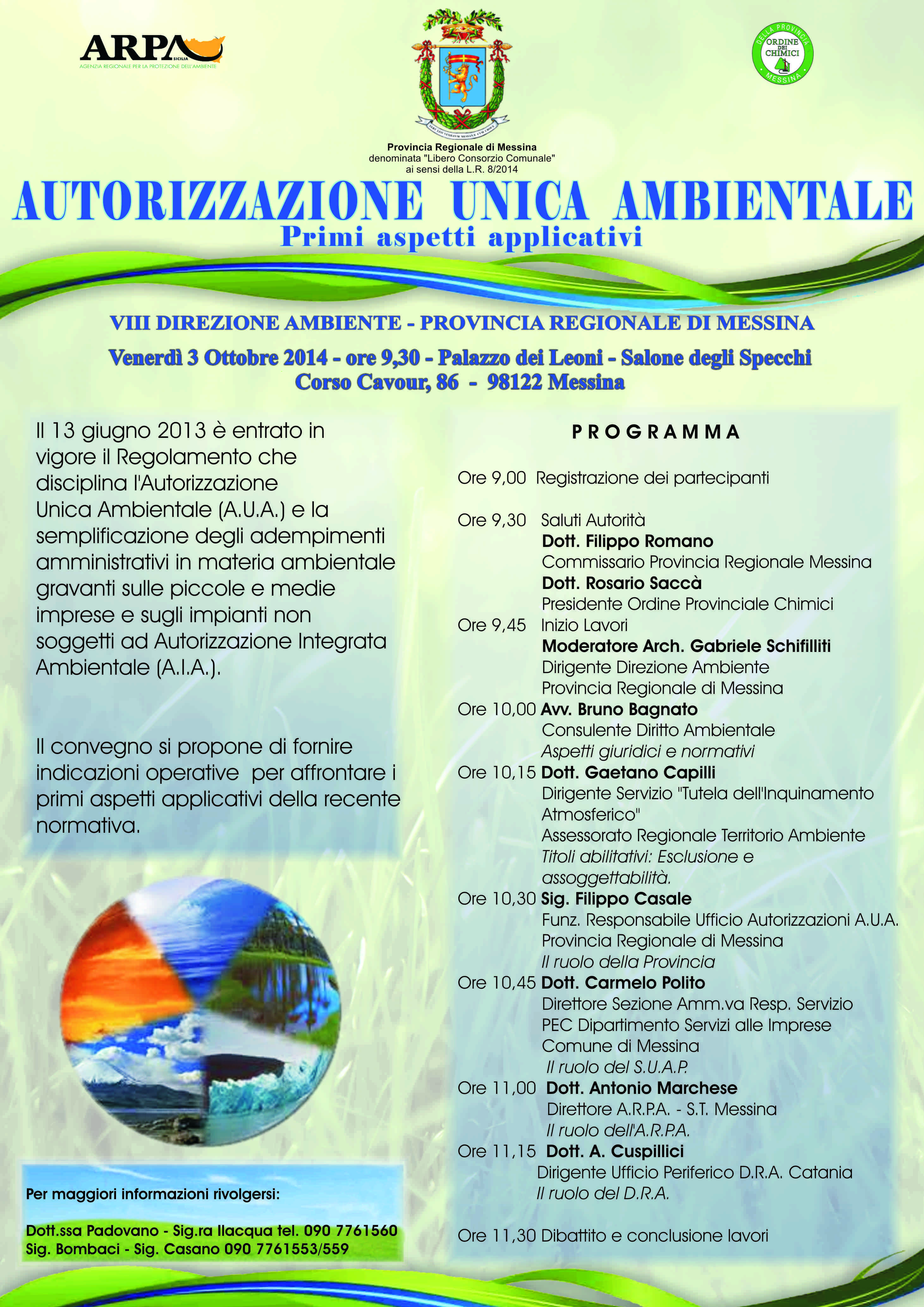 Si svolgerà venerdì 3 ottobre 2014, ore 9.30, nel Salone degli Specchi di Palazzo dei Leoni il convegno sul tema "Autorizzazione Unica Ambientale - primi aspetti applicativi" organizzato dalla 8°Direzione Ambiente della Provincia Regionale di Messina, in collaborazione con l'Arpa S.T. Messina e con l'Ordine dei Chimici della provincia di Messina.