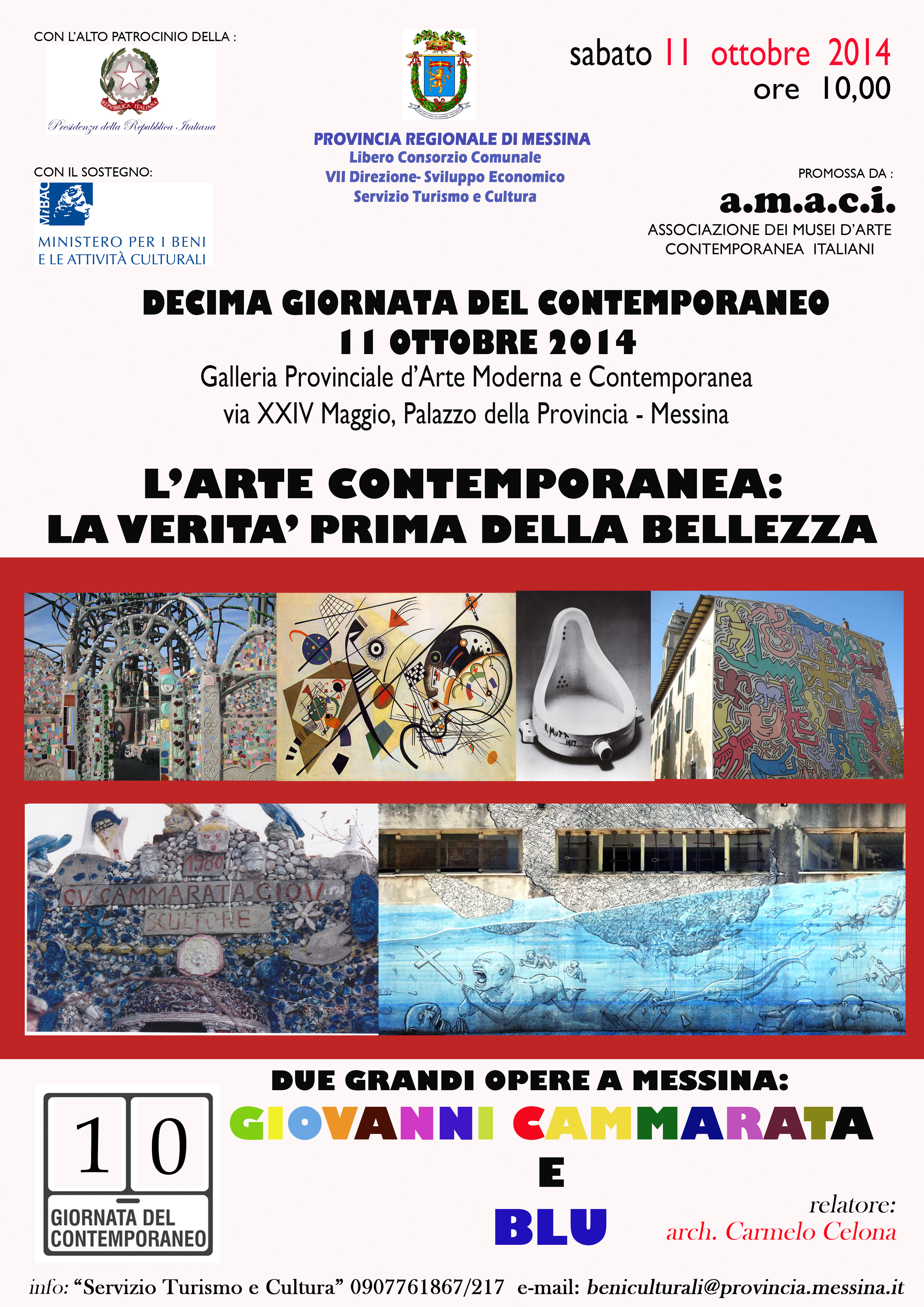 La Provincia Regionale di Messina ha aderito alla decima edizione della Giornata del Contemporaneo. In concomitanza con l'evento sabato 11 ottobre 2014, alle ore 10.00, presso la Galleria provinciale d'Arte Moderna e Contemporanea in Via XXIV Maggio, la VII Direzione "Sviluppo Economico, Servizio Turismo e Cultura" ha organizzato un incontro dedicato alle scuole sul tema "L'Arte contemporanea: verità prima della bellezza - Due grandi opere a Messina: Giovanni Cammarata e Blu".