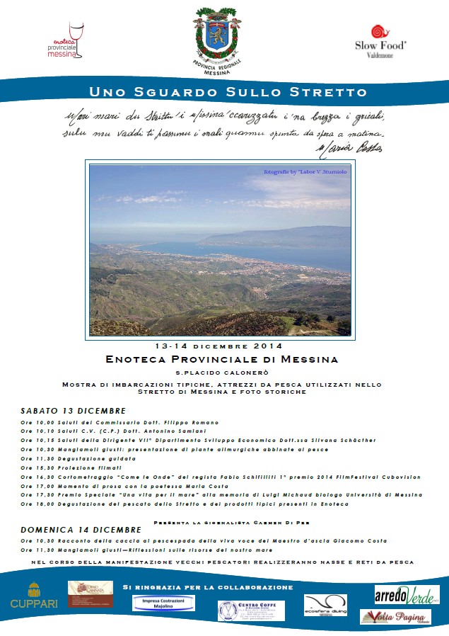 La VII Direzione "Sviluppo Economico" organizza nei giorni 13 e 14 dicembre 2014, presso l'Enoteca Provinciale di S. Placido Calonerò, la manifestazione dal titolo "Uno sguardo sullo Stretto".