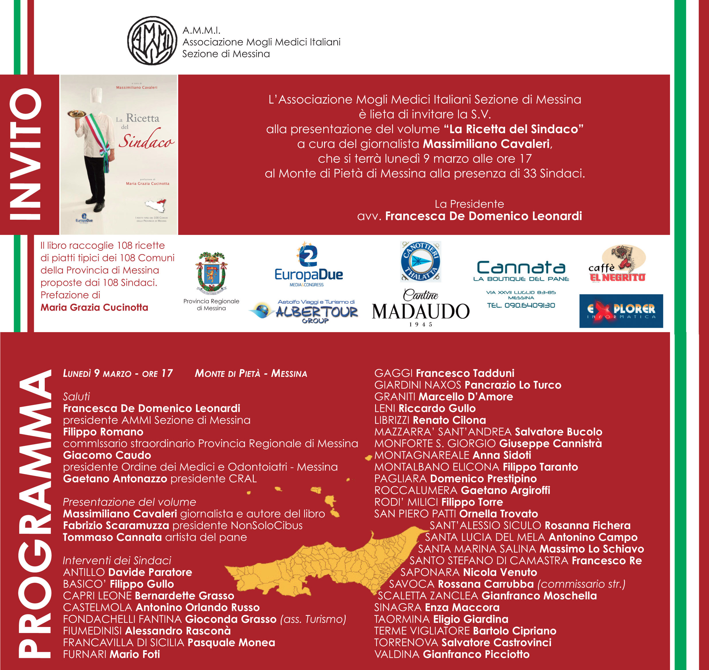 Lunedì 9 marzo appuntamento con la presentazione del volume "La Ricetta del Sindaco", curato dal giornalista Massimiliano Cavaleri che ha raccolto ricette di piatti tipici dei 108 Comuni della Provincia proposti dai 108 Sindaci con la prefazione di Maria Grazia Cucinotta, un modo originale per raccontare il territorio attraverso la tradizione gastronomica.
