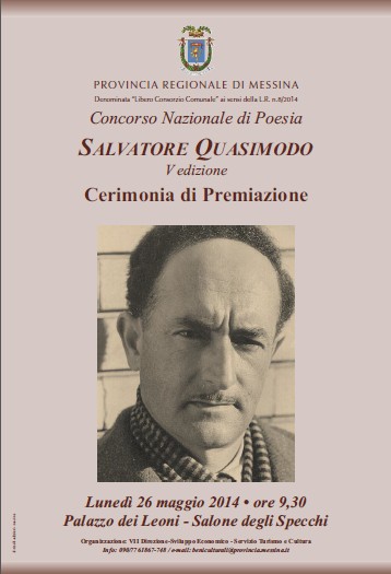 Lunedì 26 maggio, alle ore 9.30, avrà luogo, presso il Salone degli Specchi della Provincia Regionale di Messina, la cerimonia di premiazione della V Edizione del “Concorso Nazionale di Poesia Salvatore Quasimodo”, organizzata dalla VII Direzione-Sviluppo Economico, Servizio Turismo e Cultura e destinato agli Istituti Superiori di tutto il territorio nazionale. Il Premio Quasimodo, nato in occasione del cinquantesimo anniversario della consegna del Premio Nobel per la Letteratura a Salvatore Quasimodo, quale doveroso omaggio al grande poeta con l’obiettivo di divulgarne la figura e la poesia, è diventato ormai un appuntamento irrinunciabile per le scuole del territorio nazionale che aderiscono ogni anno con entusiasmo. Il programma della manifestazione prevede alla ore 9,30 la proiezione di un DVD didattico sulla vita e sulle opere del poeta Salvatore Quasimodo. Alle ore 10,00 porgeranno i saluti il Commissario Straordinario dott. Filippo Romano e la dirigente della VII Direzione dott.ssa Silvana Schächter. Seguiranno gli interventi del prof. Giuseppe Rando, docente universitario e Presidente della giuria del Premio Quasimodo, la prof.ssa Lucrezia Lorenzini, docente universitaria, il dott. Sergio Palumbo, giornalista e critico letterario. Coordinerà i lavori la dott.ssa Angela Pipitò, Funzionario Responsabile del Servizio Turismo e Cultura. Alle ore 11,00 è prevista la cerimonia di premiazione con la consegna dei premi e delle targhe ricordo agli studenti vincitori e degli attestati di merito agli studenti meritevoli di menzione.