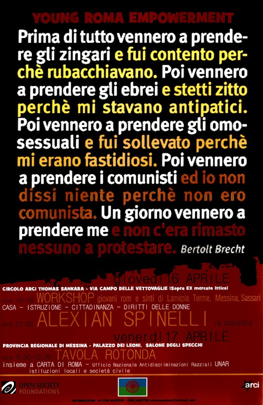 Tavola rotonda su diritti e protagonismo dei giovani rom e sinti italiani, questo il filo conduttore della tavola rotonda organizzata nel Salone degli Specchi di Palazzo dei Leoni venerdì 17 aprile 2015, dalle ore 9.30 alle ore 13.00, nell’ambito del progetto “Young Roma Empowerment” che ha coinvolto giovani rom e sinti di Messina, Lamezia Terme e Sassari.