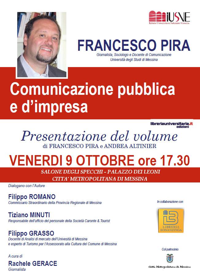 Venerdì 9 ottobre, alle ore 17.30, nel Salone degli Specchi di Palazzo dei Leoni appuntamento per la presentazione del libro “Comunicazione Pubblica e d'impresa” di Francesco Pira e Andrea Altinier.