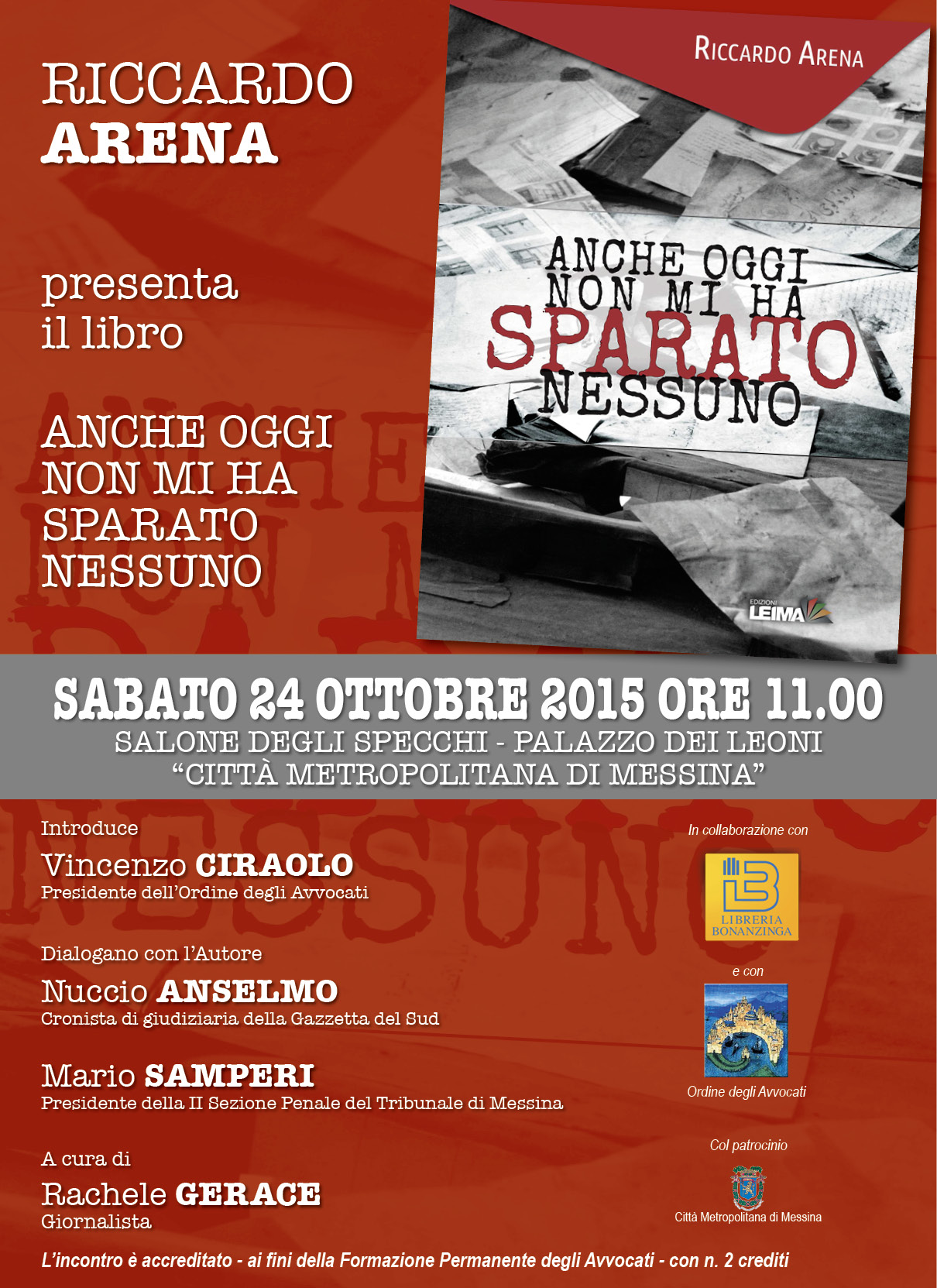 Sabato 24 ottobre, alle ore 11.00, nel Salone degli Specchi di Palazzo dei Leoni, sede della Città Metropolitana di Messina, appuntamento per la presentazione del libro “Anche oggi non mi ha sparato nessuno” di Riccardo Arena.