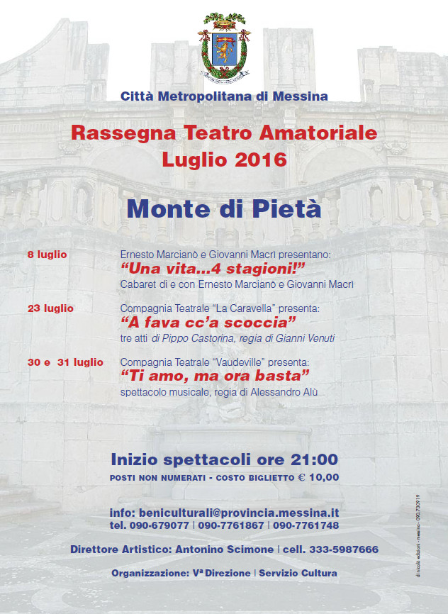 Prende avvio, presso il complesso monumentale del Monte di Pietà, il Festival del Teatro Amatoriale, la rassegna organizzata dalla Città Metropolitana di Messina che intende valorizzare le compagnie locali amatoriali e le loro proposte artistiche.