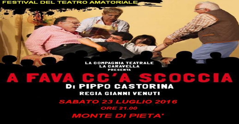 Domani 23 luglio 2016, con inizio alle ore 21.00, la compagnia teatrale “La caravella” metterà in scena lo spettacolo “A fava cc'à scoccia”, tre atti dell'attore-autore Pippo Castorina con la regia di Gianni Venuti.
