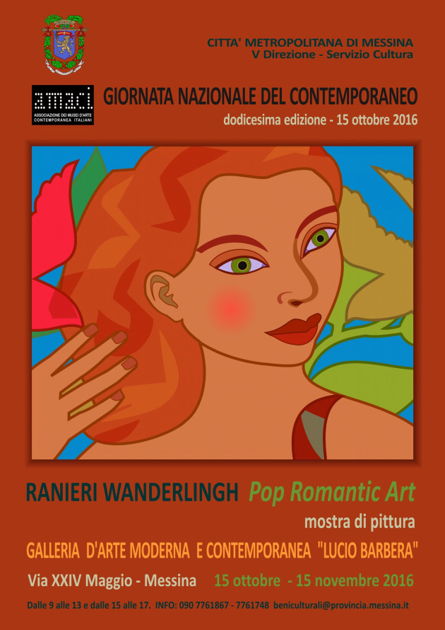 Sabato 15 ottobre, alle ore 10.00, nella Galleria d’Arte Moderna e Contemporanea “Lucio Barbera” sarà inaugurata la mostra di arti visive del messinese Ranieri Wanderlingh dal titolo “Pop Romantic Art”. L’appuntamento culturale coinvolgerà le scuole del territorio provinciale e sarà visitabile fino al 15 novembre 2016, dal lunedì al venerdì dalle 9,00 alle 13,00 e dalle 15,00 alle 17,00.