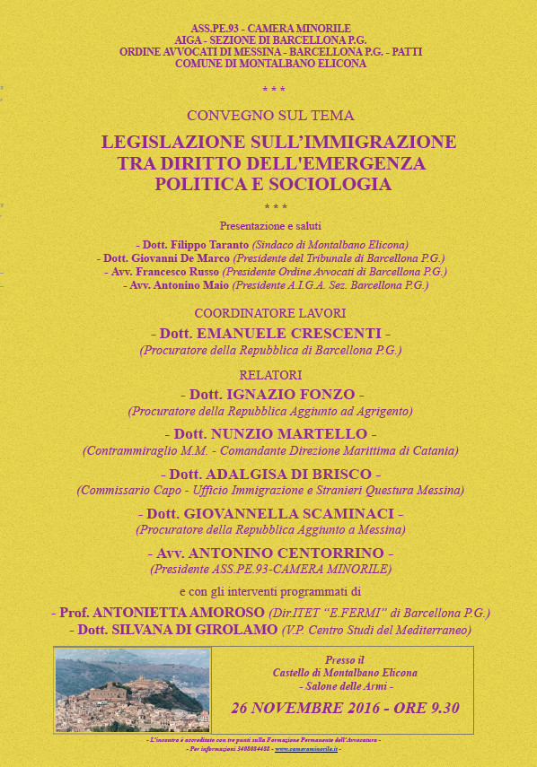 Si svolgerà sabato 26 novembre, a partire dalle ore 9.30 presso il castello Federico II di Montalbano Elicona, l'incontro formativo su "Legislazione sull'immigrazione tra diritto dell'emergenza politica e sociologica", organizzato dal Comune in collaborazione con il Centro Studi del Mediterraneo, l'A.I.G.A. (Associazione Italiana Giovani Avvocati) e gli Ordini degli avvocati di Messina, Patti e Barcellona Pozzo di Gotto.