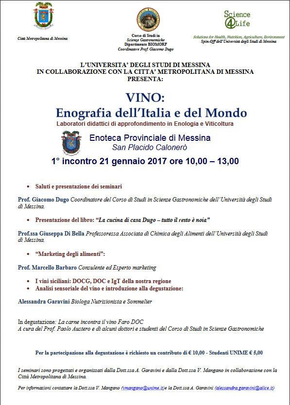 Sabato 21 gennaio 2017, dalle ore 10.00 alle ore 13.00 a San Placido Calonerò presso l’Enoteca Provinciale di Messina, si terrà il primo degli otto laboratori didattici in enologia e viticoltura dal titolo "Vino: Enografia dell'Italia e del Mondo", promosso dal professore Giacomo Dugo, coordinatore del corso di laurea in Scienze Gastronomiche (Dipartimento BIOMORF) dell'Università degli Studi di Messina ed organizzato dalla dott.ssa Garavini e dalla dott.ssa Mangano.
