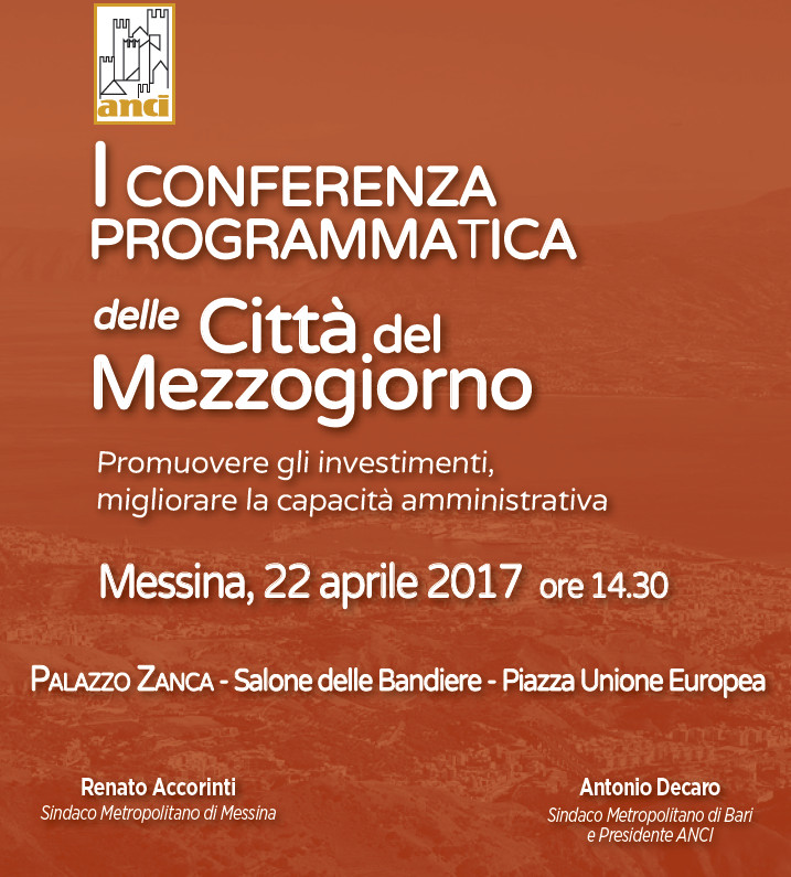 La Città Metropolitana di Messina è in piena attività per l'organizzazione della I conferenza programmatica delle Città del Mezzogiorno per la promozione degli investimenti ed al miglioramento della capacità amministrativa in programma sabato 22 aprile 2017 a Messina presso il Salone delle Bandiere di Palazzo Zanca. La fase organizzativa in corso è curata e coordinata dal Segretario Generale di Palazzo dei Leoni, Maria Angela Caponetti, e dal Capo di Gabinetto del Comune di Messina, Loredana Carrara.