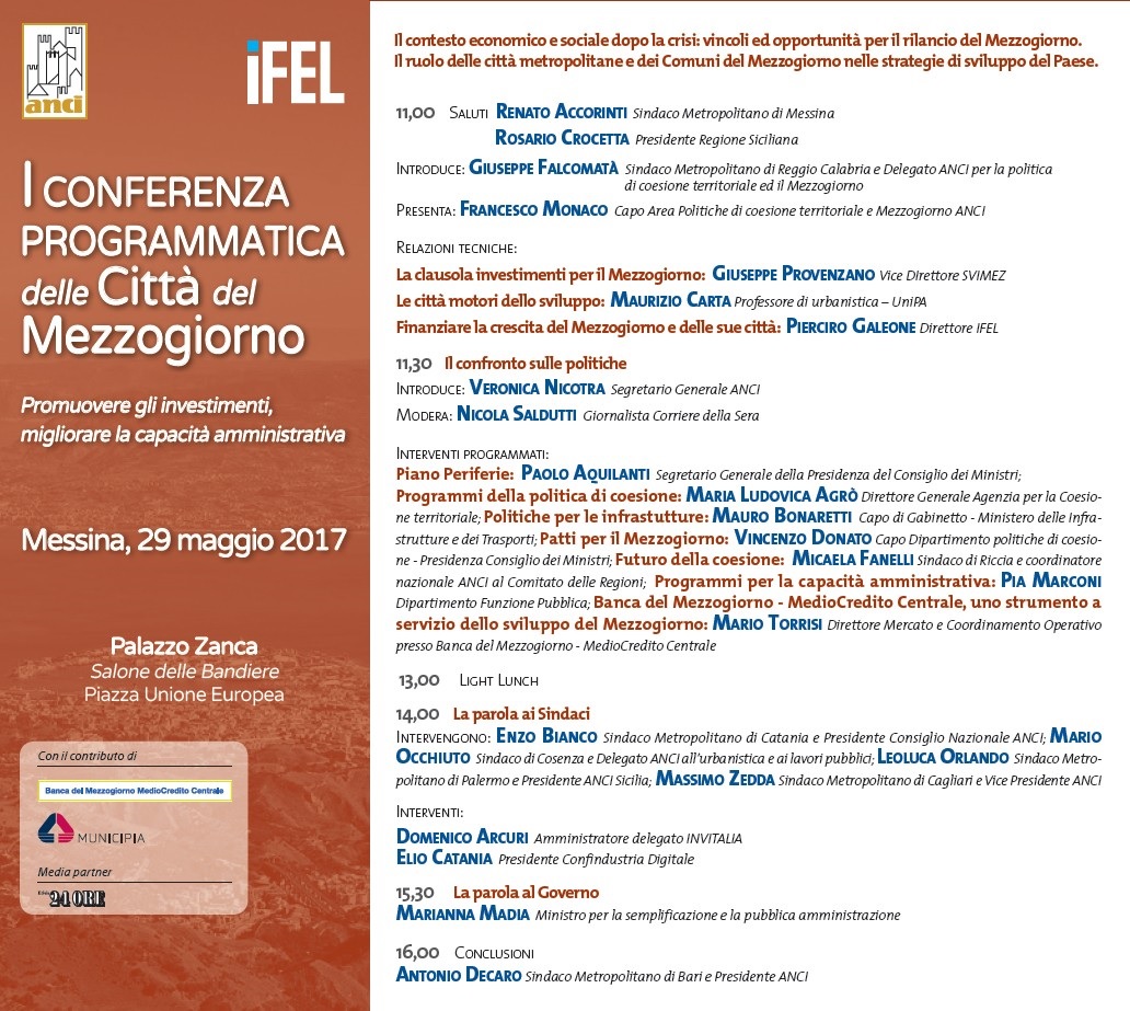 E’ stato ridefinito il programma degli interventi della I Conferenza Programmatica delle Città del Mezzogiorno che si svolgerà a Messina il 29 maggio 2017. Alle ore 11.00 l'apertura dei lavori sarà riservata ai saluti del Sindaco Metropolitano di Messina, Renato Accorinti e del Presidente della Regione Sicilia, Rosario Crocetta, mentre ad introdurre gli interventi sarà il Sindaco Metropolitano di Reggio Calabria e Delegato ANCI per la politica di coesione territoriale ed il Mezzogiorno, Giuseppe Falcomatà. Francesco Monaco, Capo Area Politiche di coesione territoriale e Mezzogiorno ANCI, presenterà l’incontro.