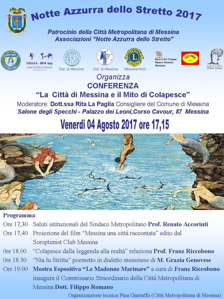 Si svolgerà venerdì 4 agosto 2017, alle ore 17.15, a Palazzo dei Leoni la conferenza sul tema “La Città di Messina e il Mito di Colapesce”, organizzata in concomitanza della “Notte Azzurra dello Stretto 2017”.
