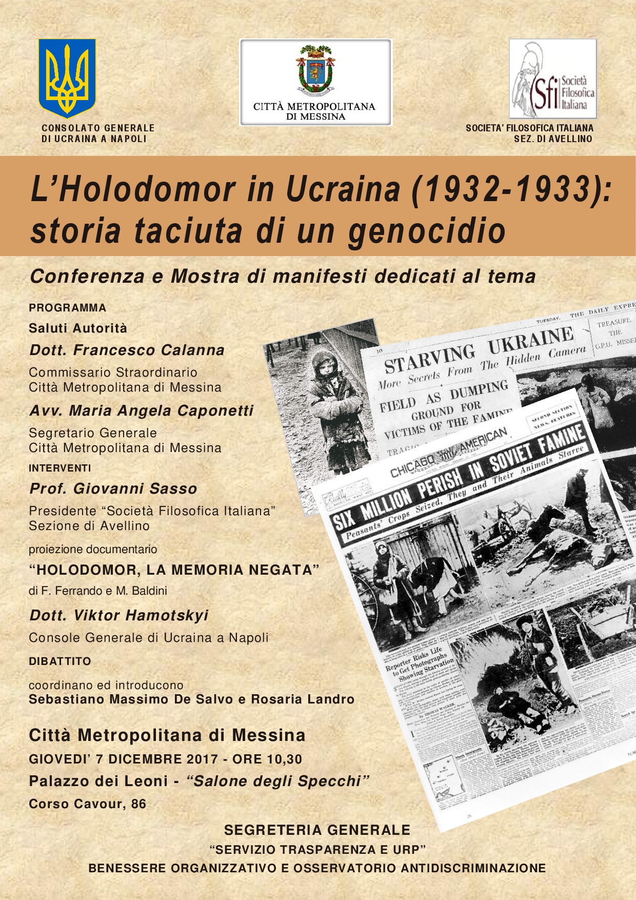Giovedì 7 dicembre 2017, con inizio alle ore 10.30, nel Salone degli Specchi di Palazzo dei Leoni avrà luogo il convegno su “L’Holodomor in Ucraina (1932-33): storia taciuta di un genocidio”, cui seguirà l’inaugurazione della mostra collaterale, allestita nel Ballatoio della sede.