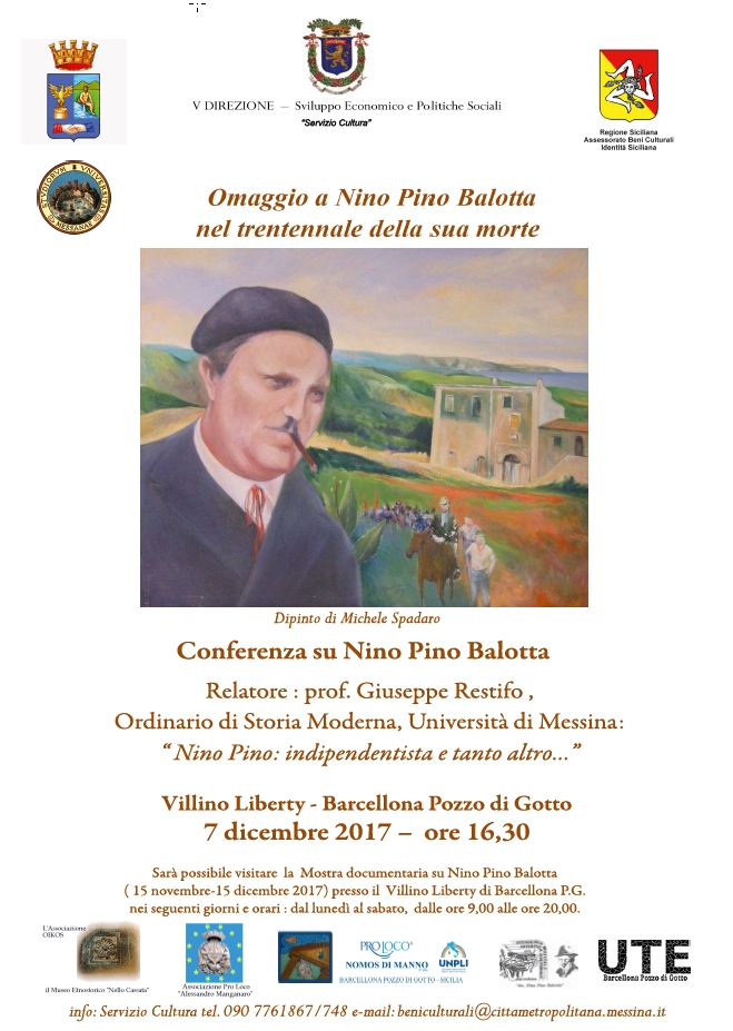 La Città Metropolitana di Messina, V Direzione, Servizio Cultura, nell'ambito della mostra dedicata a Nino Pino Balotta in occasione del trentennale della sua morte, attualmente in esposizione presso il Villino Liberty di Barcellona P.G., organizzerà l'ultimo incontro dedicato a Nino Pino Balotta. Nella conferenza sarà approfondito il ruolo di Nino Pino Balotta nei movimenti politici sviluppatisi nel messinese negli anni ’30 e ’40 del secolo scorso ed in particolare la sua appartenenza al movimento indipendentista.