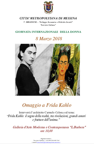 L’incontro, curato dal Servizio Cultura, avrà luogo giovedì 8 marzo, alle ore 10.00, nei locali della Galleria d’Arte Moderna e Contemporanea “Lucio Barbera” e vedrà la partecipazione dell’architetto Carmelo Celona, direttore della Galleria d'Arte Moderna di Messina, che relazionerà sul tema: “Frida Kahlo, il sogno della realtà, tra rivoluzioni, grandi amori e fratture dell’anima”, con la partecipazione degli studenti dell’Istituto d’Arte “Ernesto Basile” di Messina.