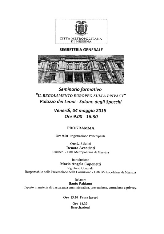 Si svolgerà venerdì 4 maggio 2018, dalle ore 9.00 alle ore 16.00, presso il Salone degli Specchi di Palazzo dei Leoni, il seminario sul tema "Il regolamento europeo sulla privacy".