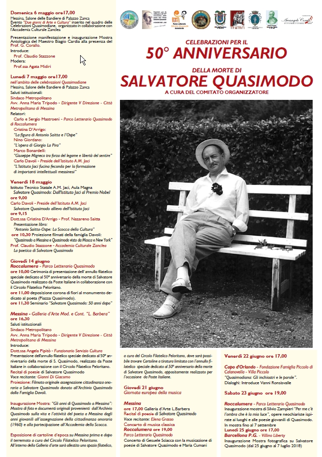 Prendono il via, domenica 6 maggio, le Celebrazioni per il 50° Anniversario della morte di Salvatore Quasimodo a cura del Comitato Organizzatore di cui fanno parte oltre la Città Metropolitana di Messina, ente promotore, l'Università degli Studi di Messina, il Teatro Vittorio Emanuele di Messina, il Parco Letterario Salvatore Quasimodo di Roccalumera, l'Associazione Club Amici di Salvatore Quasimodo, la Fondazione Famiglia Piccolo di Capo d'Orlando, il Conservatorio Arcangelo Corelli, l'Istituto A.M. Jaci e l'Istituto S. Quasimodo di Messina.