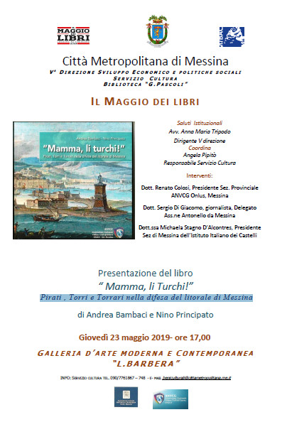Nell'ambito della campagna nazionale “Il Maggio dei Libri”, giovedì 23 maggio alle ore 17.00, presso la Galleria d'Arte Moderna e Contemporanea “Lucio Barbera” alle ore 17.00, avrà luogo la presentazione del libro “Mamma Li Turchi” (Pirati, Torri e Torrari nella difesa del litorale di Messina), di Andrea Bambaci e Nino Principato.