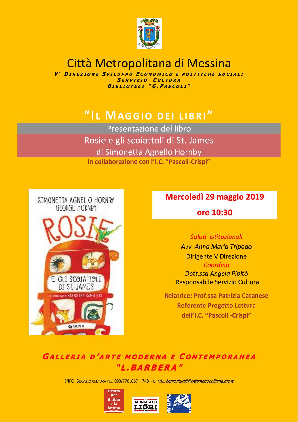 Avrà luogo mercoledì 29 maggio, alle ore 10,30, presso i locali della Galleria d'Arte “Lucio Barbera” il settimo appuntamento del Maggio dei Libri organizzato dal Servizio Cultura e dalla Biblioteca G. Pascoli della V Direzione della Città Metropolitana di Messina in collaborazione con l'Istituto Comprensivo “Pascoli-Crispi” di Messina. In questa occasione sarà presentato il volume: “Rosie e gli scoiattoli di St.James” scritto da Simonetta Agnello Hornby e George Hornby, edito dalla Casa editrice Giunti,