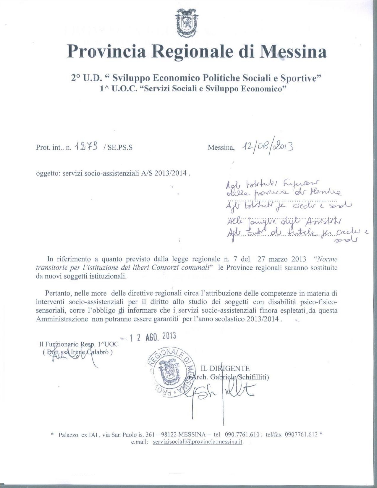 In riferimento alla legge regionale n. 7 del 27 marzo 2013 "Norme transitorie per l'istituzione dei liberi Consorzi comunali" e nelle more delle direttive regionali circa l'attribuzione delle competenze in materia di interventi socio-assistenziali per il diritto allo studio dei soggetti con disabilità psico-fisico-sensoriali, si informa che i servizi non potranno essere garantiti per l'anno scolastico 2013/2014.
